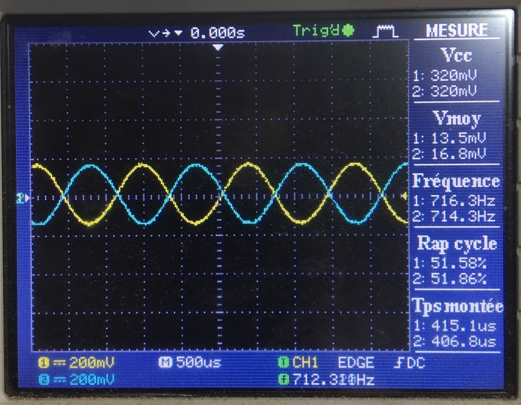 Mesure secondaire avec CT, l'amplitude du signal entre les 2 courbes en opposition de phase est de 340mV + 334mV = 674mV, proche des 686mV ci-dessus, peut-être est-ce OK après tout …