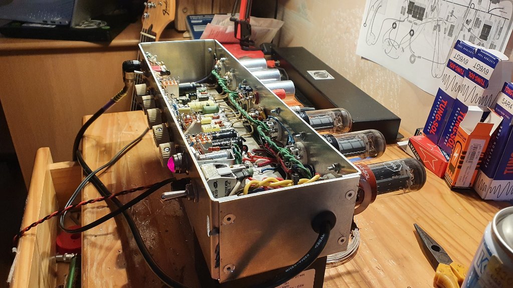 Je vous présente le dernier né, le "Tweed Terror", un 5E3 trèèèès modifié avec au programme: