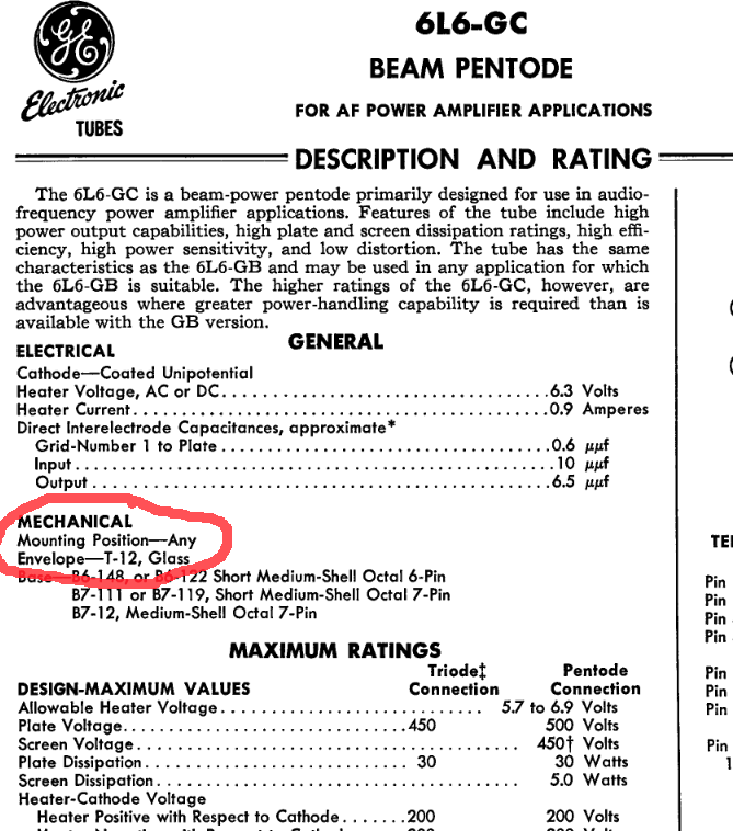 La plupart des lampes fonctionnent dans toutes le spositions. I suffit qu'elles aient un système de maintien, comme le blindage des 12A-7 ou les ressorts des EL84. C'est en général précisé dans les datasheets.