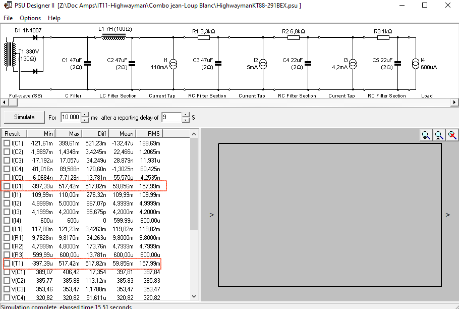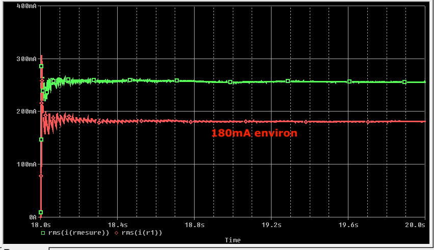 Toujours méfiant, j'fais un coup de PSUD et je vois (ou bien je crois voir) que l'intensité qui traverse la diode D1 (ou le transfo T1) est plutôt à 157.99mA RMS (un petit gloups)