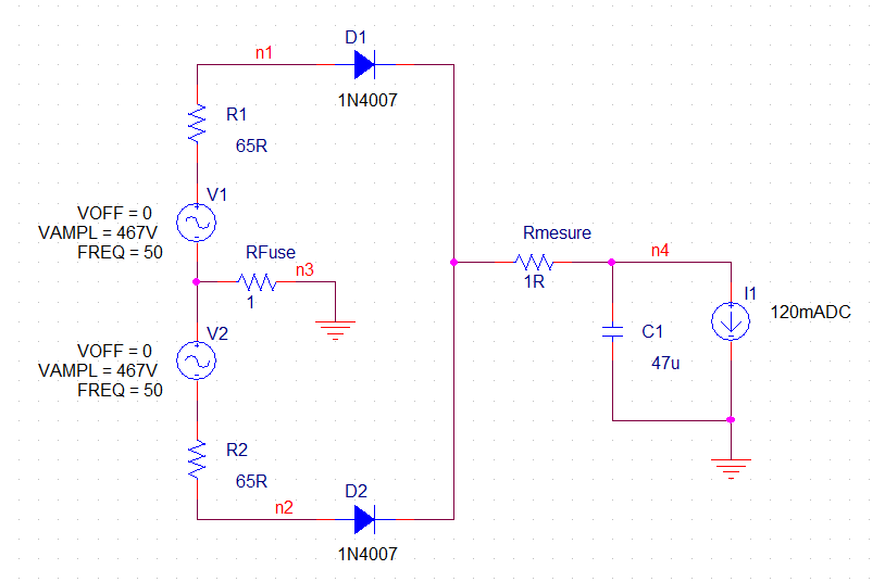 Puis je lance mon SPICE vintage avec le schéma suivant : et voici le résultat : Là, on est à 180mA RMS, donc on tire quand même bien sur la gueule du PT donné pour 130mA