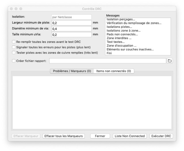 - la vérification DRC qui indique si toutes les liaisons sont conformes au schéma (mais d'hab, je le fais au Stabilo entre mon layout et le schéma, ça fonctionne pas mal non plus
