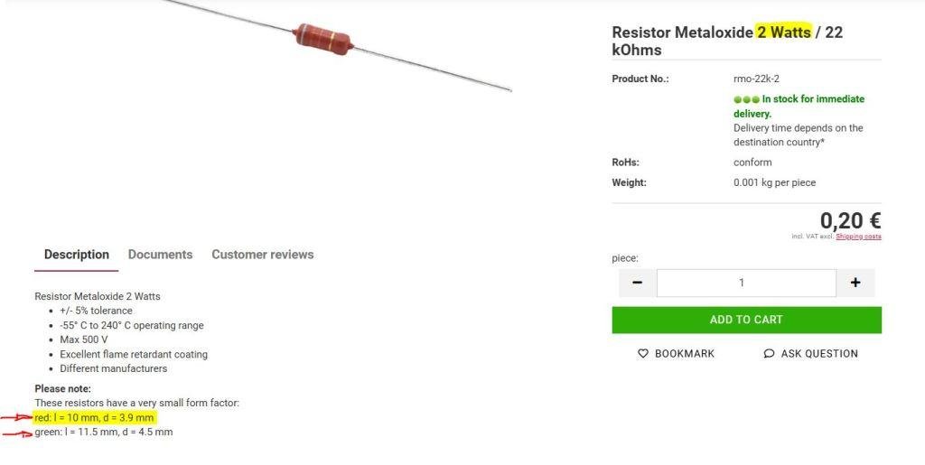 Effectivement, sur le site de Tube Town, il vend des résistances en 2W qui ont les dimensions des 1W (les rouges) et des résistances de 2W qui ont bien les dimensions des 2W (les vertes) !