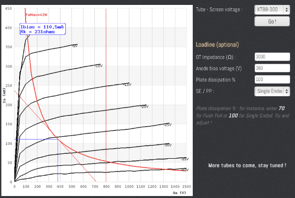 Imaginons un ampli SE utilisant une KT88. Je polarise à : Uak = 380V, Ug2 = 300V, Ia = 110mA, Rk = 230Ω