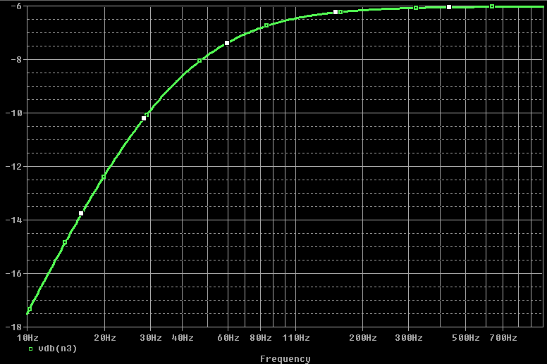 Pour Pote Gui : non, les -6dB ne viennent pas de là : simplement, pour la simul et les courbes, j’ai pris Rload = 100k et Rout = 100k pour que ce soit démonstratif, et comme le souligne Arnaud, à « hautes fréquences », la capa est un fil passant, du coup on a un simple pont div 100k / 100k, atténuation de 2 => -6dB (en voltage)