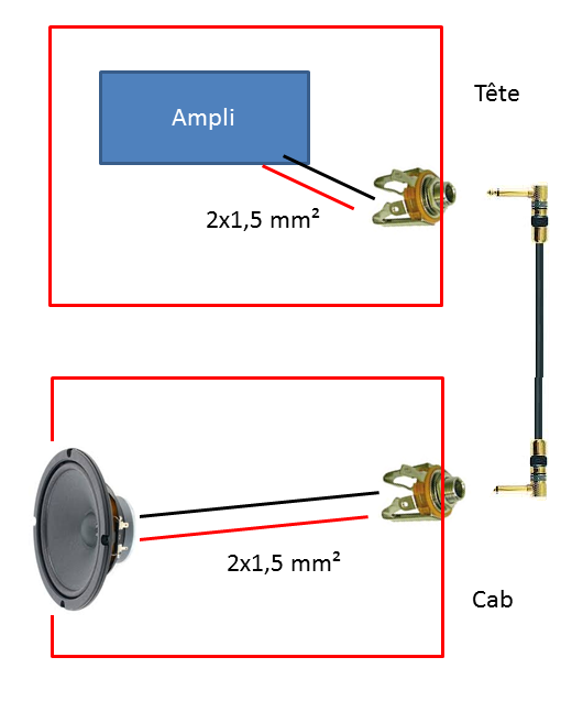 Le câble entre les 2 jacks mâles (donc le bout de fil qui rejoint tête et cab en passant par l'extérieur) doit également être du 2x1.5mm2 non blindé, sinon risque de cramer l'ampli (loin d'être systématique, un poil théorique, mais risque quand même : faible section de câble + effet capacitif)