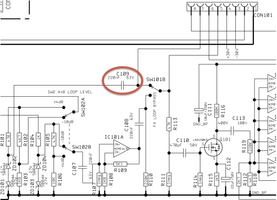 Je serais toi, je réinstallerai un C109 neuf : 220nF 63V, tu trouveras chez n'importe quel détaillant électronique, et encore mieux en récup sur des vieux circuits (souvent d'ailleurs de bonne qualité : philips, Wima,... en qualité MKP ou MKT). Comme çà la boucle sera fonctionnelle (du moins si tu as trouvé le fameux ampli op "haute tension"). Donc vérifie aussi IC101 (et IC1, mais je suis quasiment sûr qu'il est mort à cause du CC).