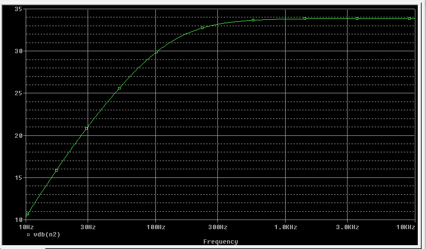 Gbf = A / (1 + BA) , avec B ( béta) = 1/15, Gbf = 45 / (1 + 45/15) = 45/4 = ~ 11. Ce qui fait 20.8 dB . Une simulation devrait montrer une courbe pour les aigus qui descend lentement de 33 dB vers 20.8 dB (ou un peu plus étant donné que 47p est loin d'être un court-circuit dans la bande audio).