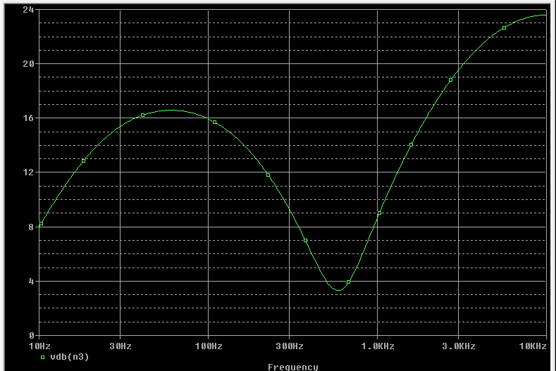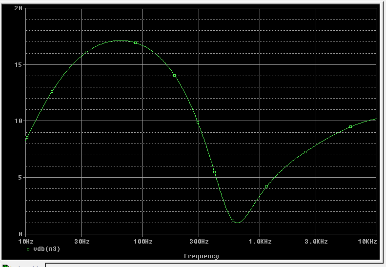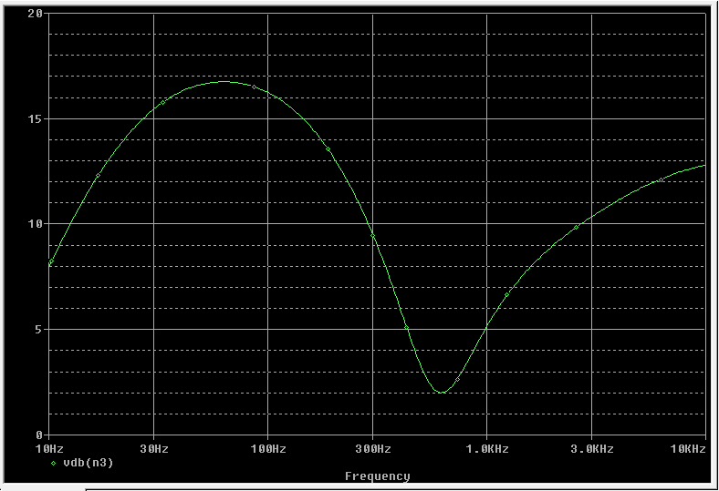 Avec la capa considérée pour les aigus en court-circuit on a comme gain - R2 / R1 =~ 15. Enfin disons plutôt que l'on aurait 15 si le gain A était infini ou très grand comme l'est le gain d'un AOP. Ici le gain A est de 45 en boucle ouverte. On trouve facilement ce que ça donne en faisant :