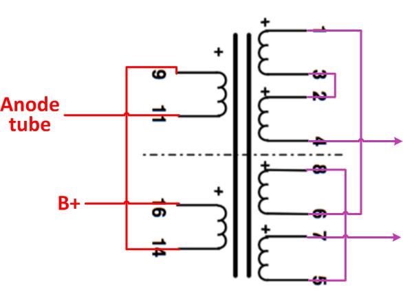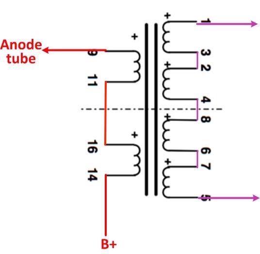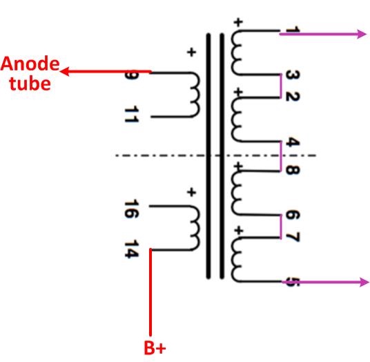 Voici ce que j'aurais fait (et d'ailleurs, en fils volants, c'est comme ça que j'ai testé le rapport de transformation de l'OT après l'avoir dessoudé) : (mais peut-être leur câblage permet-il de mieux équilibrer les enroulements, que sais-je ?)