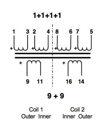 Voici la présentation des enroulements : Et voici le schéma de câblage qu'ils proposent pour une sortie 600Ω symétrique : (et pour le transformer en "unbalanced", ils placent le [7] à la masse, ce qui fait péter le fusible de mon préamp)