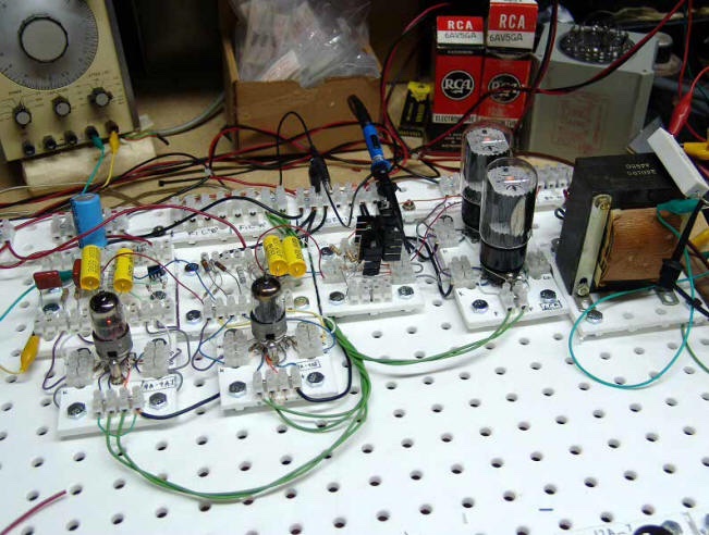 Les trois barres noires sont des 'ground bus', le reste à été fixé pour interconnecter les composantes le plus facilement possible (j'ai parfois quelques soudures à faire). Ce que je trouve pratique en plus de la vitesse de montage, c'est le fait de pouvoir mettre de coté tout le projet, l'appuyé contre un mur et libérant ainsi mon atelier. Actuellement je suis limité à un PP 2 lampes, question d'espace, il faudra que j'en fabrique un autre plus large, et peut être mieux pensé.