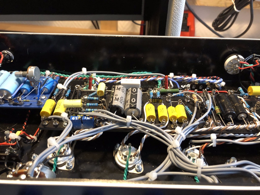 Blencowe, c'est comme tous les gurus, faut en prendre mais aussi en laisser ! Je vois un paquet de filasses dans ton ampli et pour moi ce n'est pas forcément la meilleure technique. Il faudrait plutôt que les composants sur le board correspondant à un étage soient en face de la lampe concernée pour ne pas avoir à tirer des longueurs de fils. Si tu regardes un eyelett board Fender AB763, tu verras que c'est assez bien fichu de ce point de vue.