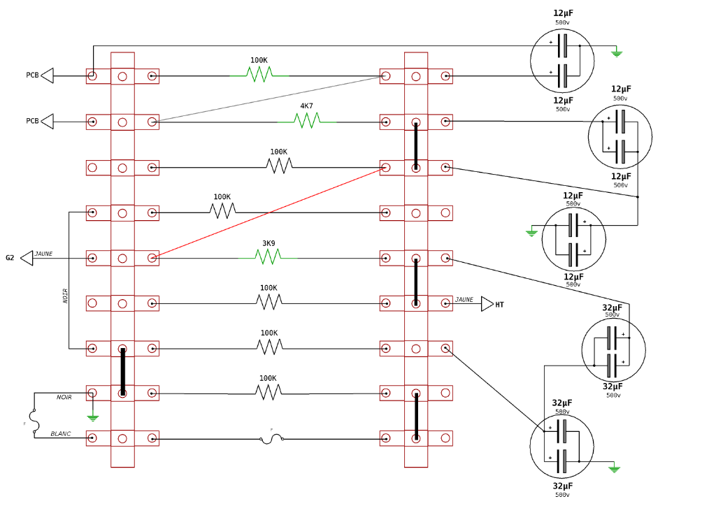 Pour l'alim je me suis posé la même question que martin_rotsey et au final j'ai commandé un double 50 uF+50 uF https://www.banzaimusic.com ... -500V.html pour garder le montage d'origine (à la place de deux 64uF) - ça permet d'augmenter la marge de tension.