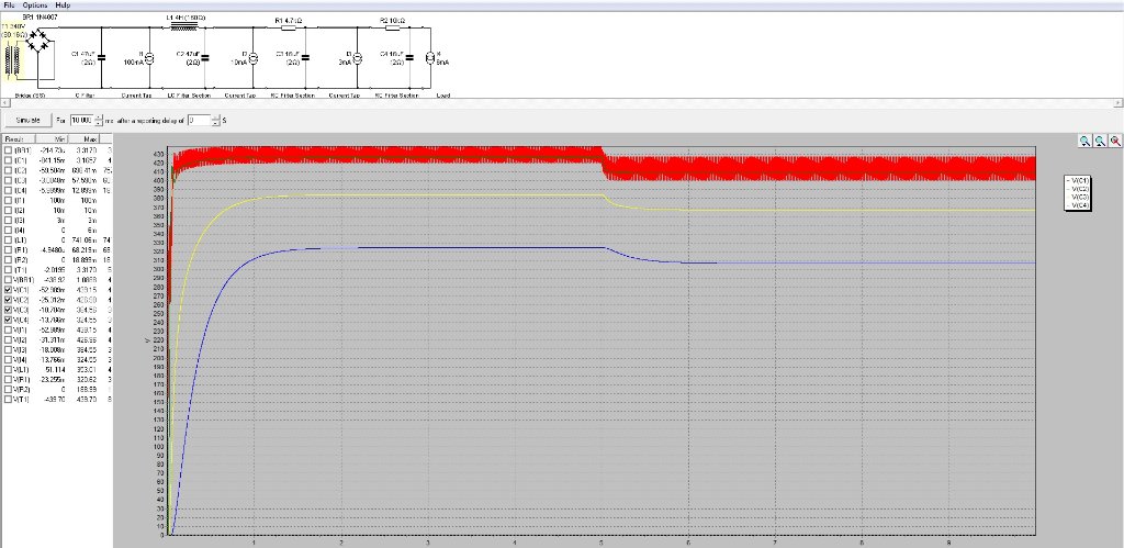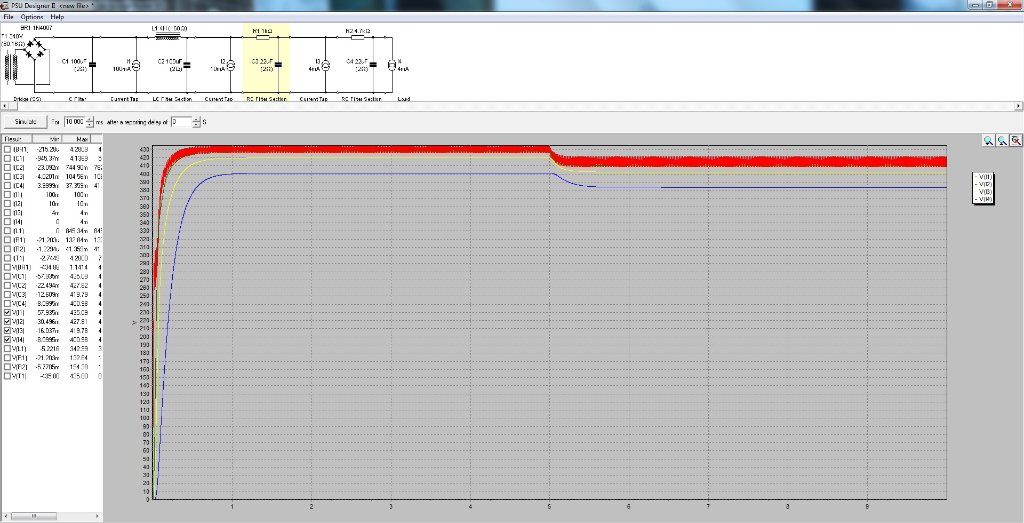 J'ai donc intégrée mon redressement par pont de diodes silicium, une première cellule de filtrage C/L/C puis deux cellules R/C.