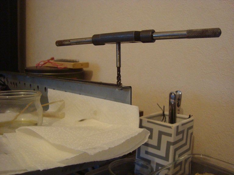 Une fois les perçages à 4,2mm effectué j'ai donc taraudé à 5mm, opération toujours délicate car un taraud est un outil à la fois très dur mais aussi de fait très cassant. Il faut y aller très progressivement et en prenant soin de bien se positionner le plus perpendiculaire possible tout en lubrifiant régulièrement.
