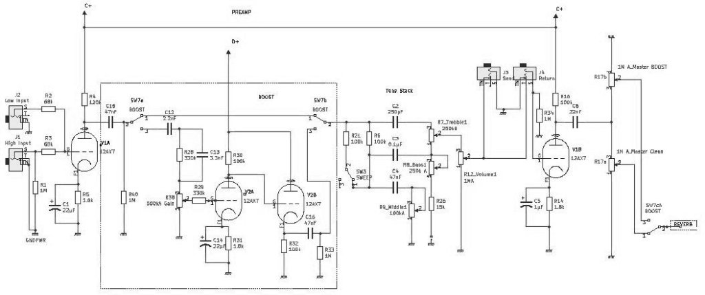 Pour moi, soit la valeur des deux potars (1M log) n’est pas adaptée, soit il faut que je calme la sortie de la 12AX7 de boost en changeant la résistance R32 de 100k par deux résistances de 68k et 33k par exemple, en faisant partir le signal (vers le C16) entre les deux (ne pouvant pas mettre de potentiomètre à la place de R32 vu la tension élevée, je remplace par une valeur fixe de 68k par exemple...)