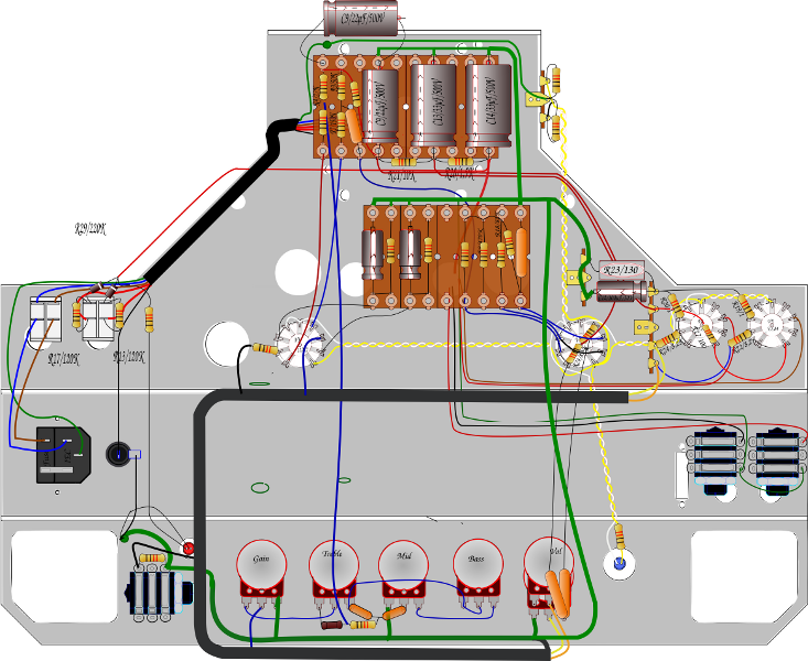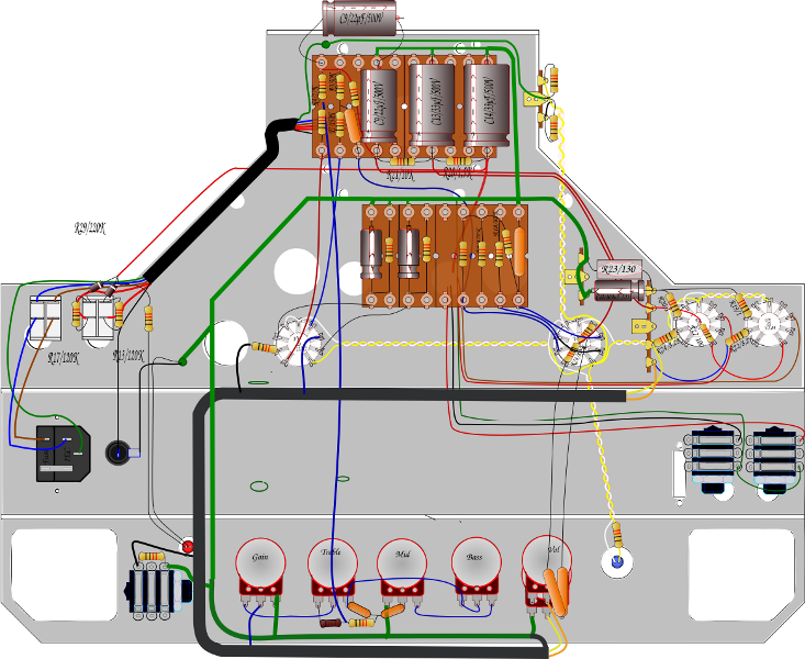 - cablage qui part de l'alim, bifurque sur le PI d'un côté, va au préamp puis au jack d'entrée pour revenir vers le préamp (potars) de l'autre