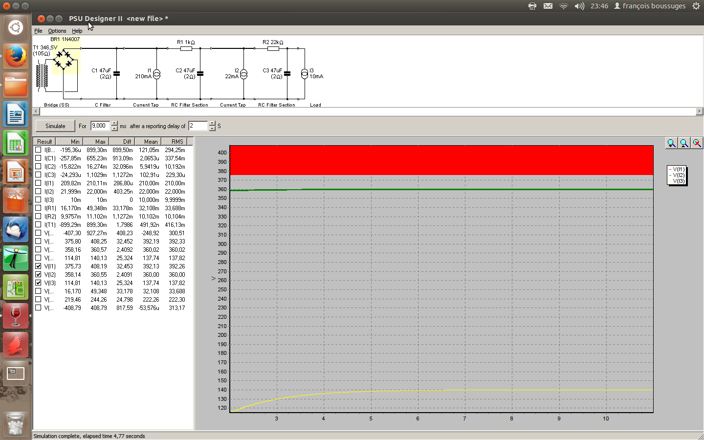 j'ai refais une simu sous PSU (HT 315V 0.3A 10% de régul). avec la conso théorique au repos (70mA d'anode + 15mA de g2 + 10mA de preamp/dephaseuse) et une conso d'un PP de 6L6 sous 450v a l'anode, 400v sur g2 et 6,6k sur le transfo (210mA+ 22mA donnée issu de la data GE) pour 55w (large donc). La tension chute un peu mais reste correcte. la partie preamp sera certainement à réadapter (changement de valeur des résistances de l'alim) pour obtenir les tensions indiquées sur le schema d'origine (115V/175V pour la partie preamp, 300V/280V sur la dephaseuse).