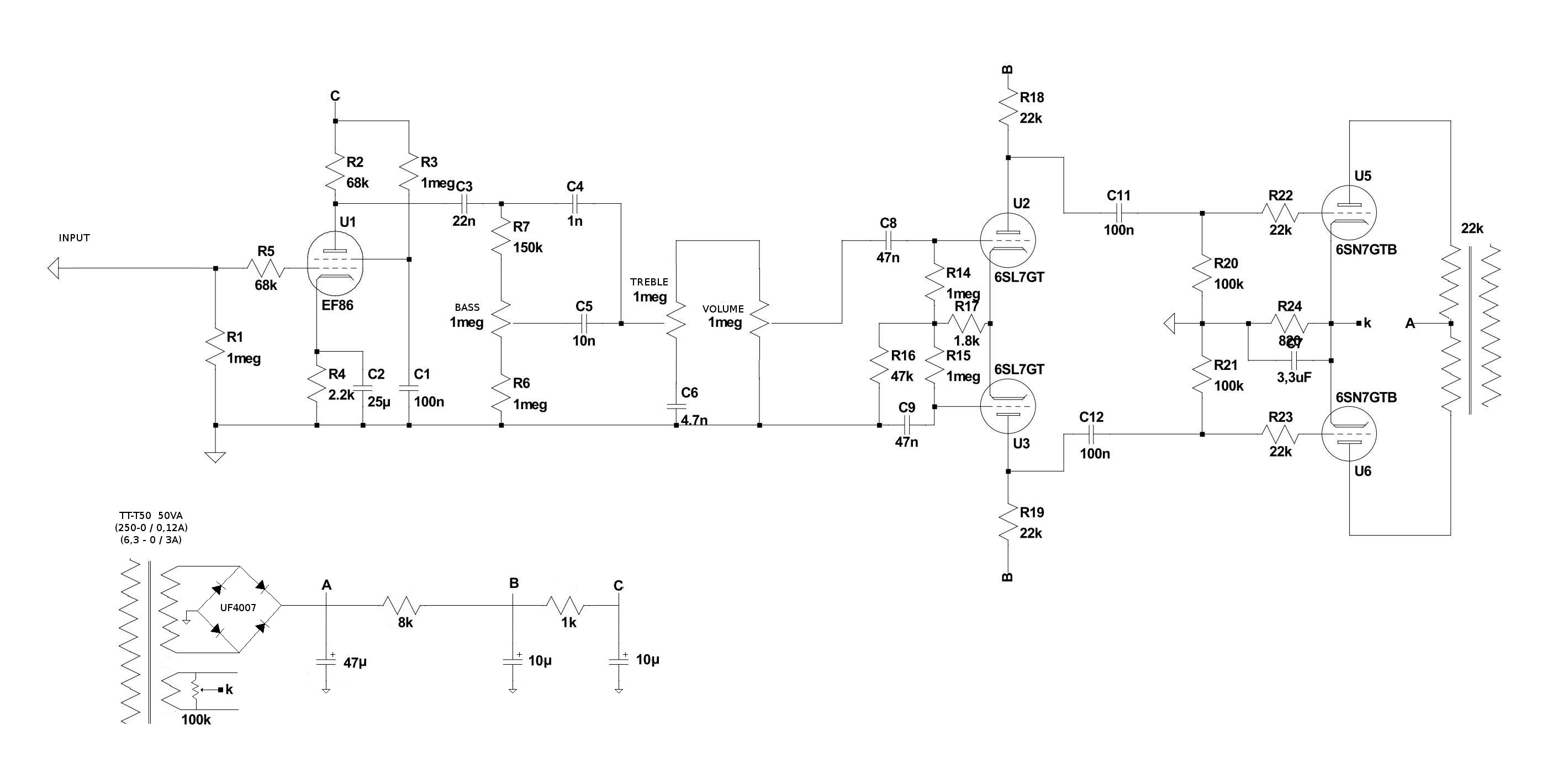 Tu fais bien de revoir l'ensemble car ton objectif de combo d'appart pour sortir du gros blues ou du rock qui tache ne semble pas à la portée d'un seul étage de gain même en EF86 avec un gain de 100-120. A titre de comparaison le gain d'un préampli Marshall Master Volume type 2203/2204 est de 9545 !