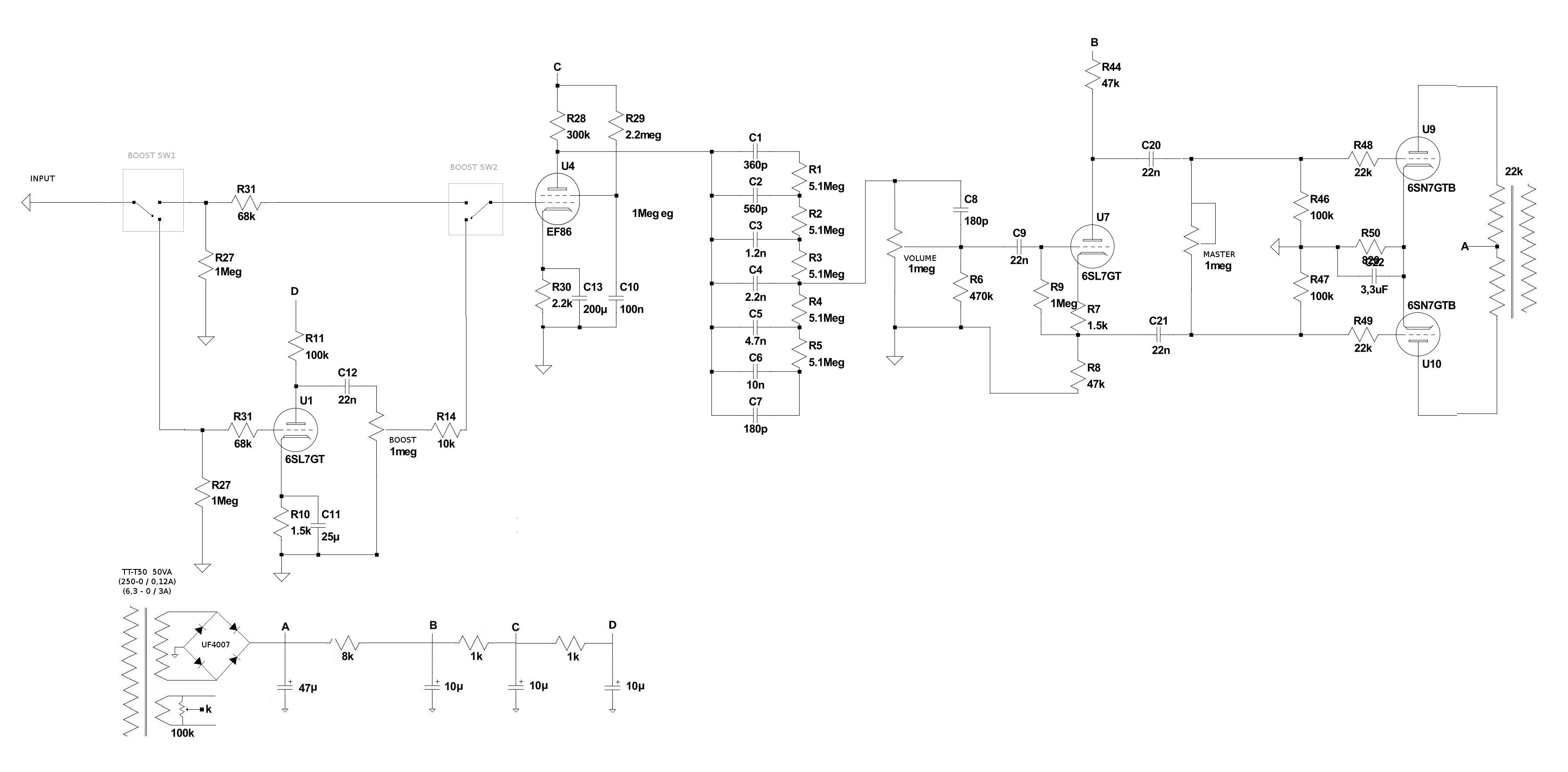 je conserve le schema initial du Nighthawk en remplaçant le PI par un cathodyne. La deuxième triode de 6SL7 est utilisée devant l'EF86 comme un boost switchable.