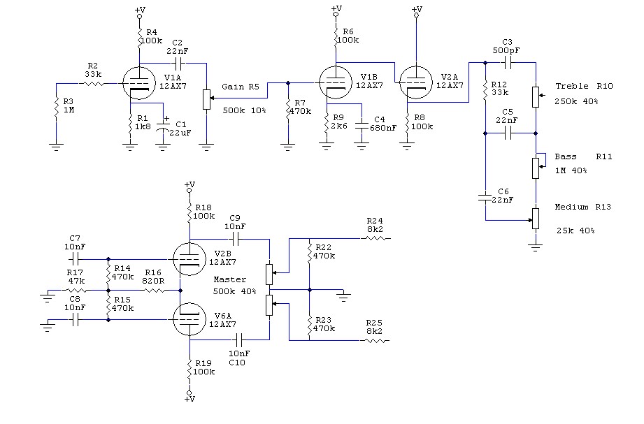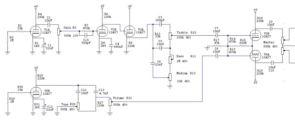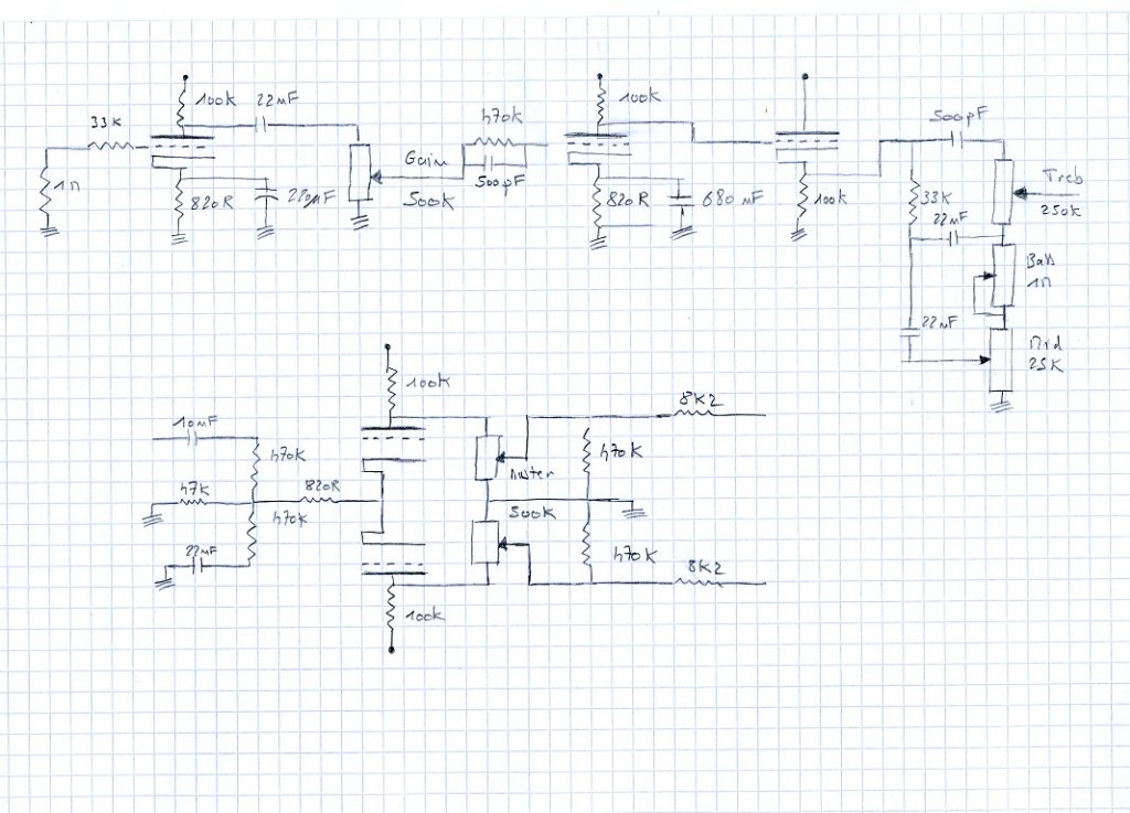 2 remarques rapides (je n'ai pas étudié longtemps le schéma) : 1/ Tu ne filtres pas les basses, c'est cool pour le clean, mais ça va trop baver bien dégueu en crunch, à mon avis, par ailleurs la 820R à la cathode, c'est plutôt pour 2 triodes et 2/ Ton PI va s'en prendre plein la gueule : une saturation de PI, c'est sympa (c'est le crunch marshall vintage, le PI crunche en premier) mais là, c'est vraiment too much imho, il va partir sur Mars direct