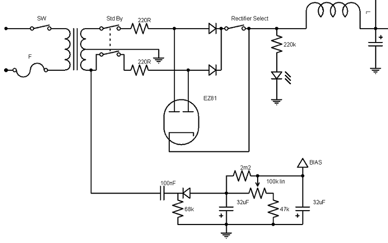 Je m'y suis pris à l'arrache, vous pouvez me faire confiance sur la question, voici l'alim: Pour imiter le "bold/spongy" du Mesa, j'ai bêtement utilisé les enroulements 240 et 220 du primaire avec un switch (qu'on ne voit pas sur le schéma)