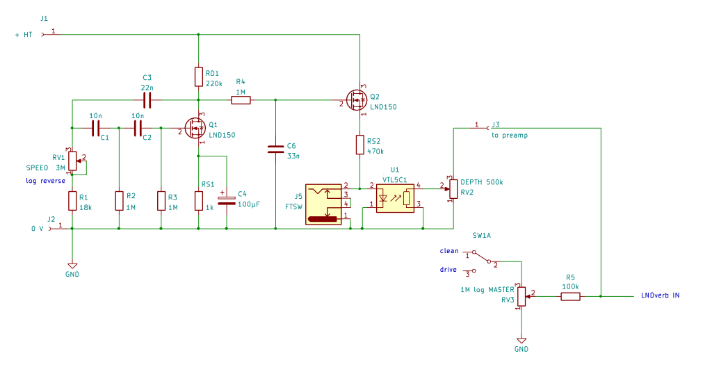 Après pas mal d'heures de tests de diverses configs, utilisation de l'entrée A de la LNDVerb en réduisant le gain, prise de l'entrée A à la sortie de V1A (mais en envoyant du clean dans la reverb en étant sur le canal drive... pas concluant) bref, retour à quelque chose de plus standard, je vous soumets le schéma mis à jour avec les meilleurs résultats obtenus.