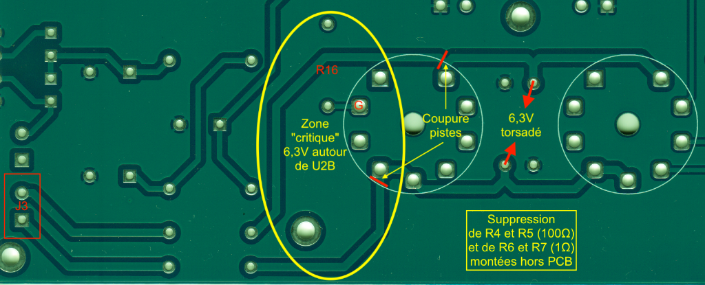Ci-dessous une proposition d'intervention sur le PCB qui ne laisse que peu de pistes de 6,3V (quelques cm entre les deux tubes) avec déport des résistances (R3, R4, R6 et R7) hors du PCB.