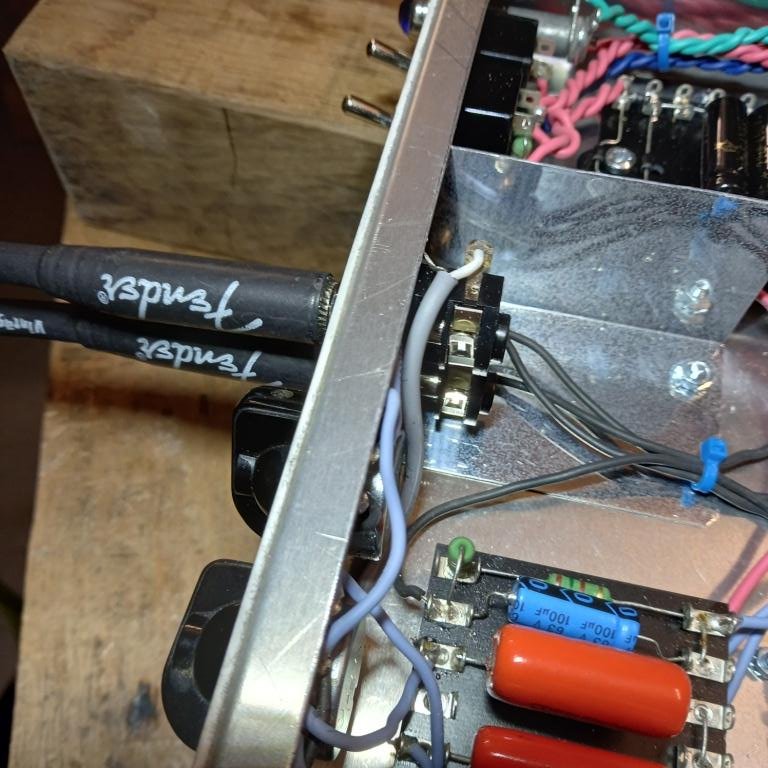 Ensuite j'ai eu des disfonctionnements avec les potards médium et aigus. J'ai refait les soudures. Tout va bien. Pareil: Câbles sonores.