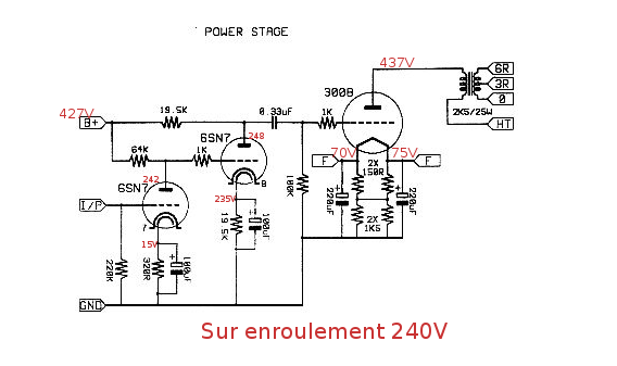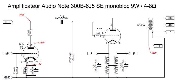 Pour la 300B, je n'ai pas l'habitude des triodes à chauffage direct et de leur mode de polarisation. Cela dit, au détail près que l'on doit sans doute soustraire les 5V DC du chauffage, ça doit être grosso modo la même approche, à savoir que ta polarisation équivaut à la différence de potentiel entre la cathode et la grille de commande alias g1. Ici, on serait dans les (70+75)/2-5=67,5V. Donc, la polarisation serait de cet ordre, +/- 5V. Si tu regardes les courbes caractéristiques d'une 300B, déjà tu t'aperçois que j'ai dis une connerie dans mon précédent post, car j'ai oublié de retrancher la tension de cathode de celle présente à l'anode pour avoir la véritable tension d'anode à savoir donc : 437-70=367V. Ouf, on est en-dessous du max! Rk=(1500+150)/2=825, et donc Ik=67,5/825=82mA. Par rapport aux courbes de caractéristiques, c'est un peu mou (on s'attendrait plutôt à 100mA). Mais, il faut vérifier mes calculs, pour être sûr que je n 'ai pas commis d'erreurs (ce qui m'arrive hélas, bien souvent)...