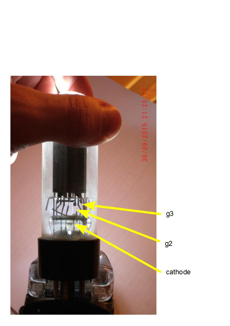 Oui, je suis très surpris que le PT ait tenu. À l'inspection visuelle, j'avais d'emblée annoncé la mort quasi certaine du transfo d'alim. Et puis, après réflexion (R de screen grid fondues, condo de filtrage dégoulinant, câbles HP mal fixés), j'ai ensuite eu des doutes sur l'intégrité physique de l'OT... Il faut vous dire que 2 6L6GC sur 4 présentent des sévices internes importants : le câblage interne au tube de la g2, g3 a fondu, celui de la cathode a tout bonnement disparu (cf photo)... De plus, une R de cathode de la 12AT7 drivant la reverb a également morflé, le filament de ce tube ayant d'ailleurs lui aussi fondu dans l'action. Or, étant donné que tout ce beau monde a comme point commun le standby qui a grave ramassé, je me suis dit que l'OT s'est emballé entraînant les tubes de puissance avec, puis les condo de filtrage à la suite et qques colatéraux de passage. Mais je ne m'explique pas pourquoi le chauffage a pris un jeton au passage, sans endommager le PT...