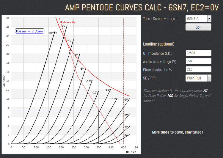 - l'étage de puissance: puch-pull de 6SN7, dissipation max par triode 5w, 7,5W pour les deux (voir datasheet ici: http://www.radiostation.ru/tubes/6SN7.pdf). partons sur 70% de dissipation max sur le PP: 7,5 x 0,7 /2 = 2,6 watts par triode. le primaire du transfo de sortie fera 22,5k (transfo hammond 125xxx). alimentation de l'anode autour de 350v.