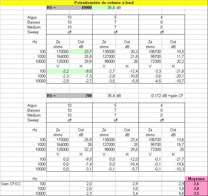 La première moitié supérieure du tableau concerne le schéma d'origine du G5V3 avec RS =49 k, et l'autre le G5 modifié avec CF.