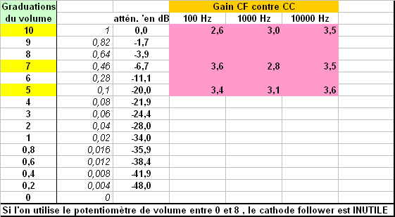 En fonction de la position du curseur du pot de volume (colonne de gauche) on a l'atténuation en linéaire et en dB . A droite le tableau des 9 valeurs est suffisant pour tirer les conclusions . Avec le pot de volume à fond la perte de 3 dB environ ne peut être compensée. Avec le pot à 9 , on peut récupérer 1.7 dB sur les 3 perdus. A partir de 8 la moindre intervention consistant à pousser le curseur un peu plus haut compense largement l'absence de CF