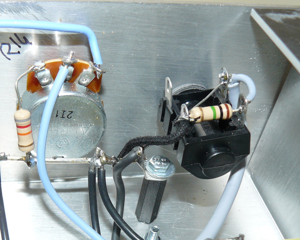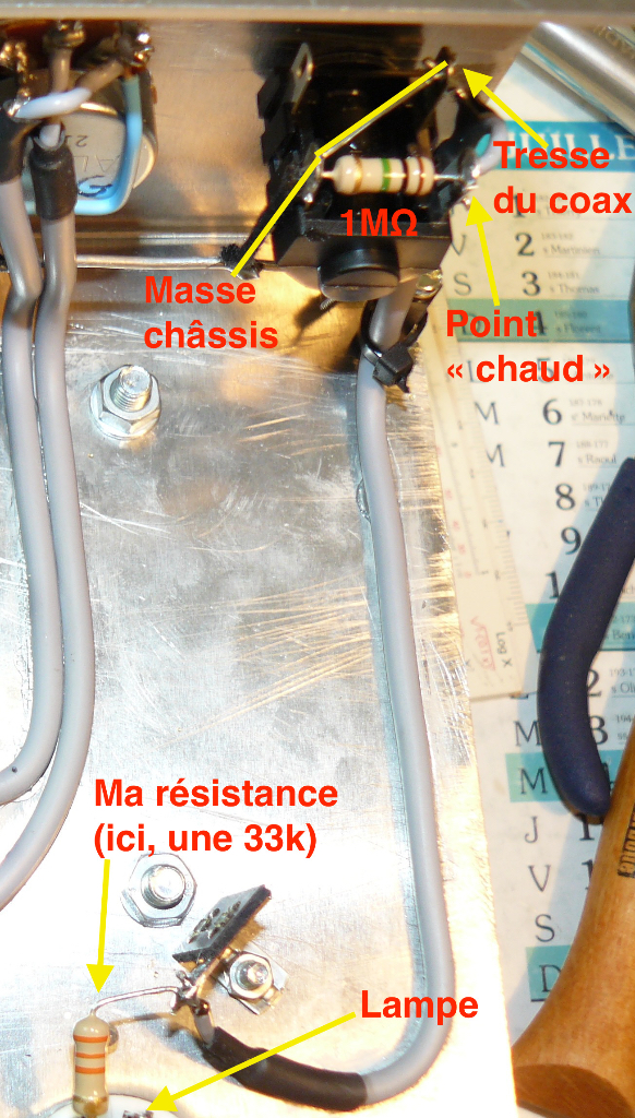 Dans l'ordre, ça donne ceci : pin d'entrée du jack ---> R de 1M à la masse ---> R de 68k ---> pin 2 (ou 7) du socket de V1.