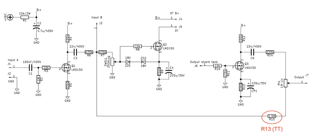 Tu as donc le signal direct atténué par le pont diviseur R7 (je pense que c'est la R52 de TT) et le DWELL, et ensuite encore atténué (dans une certaine mesure) par R15 (R13 chez TT) + le pot de mix + l'impédance de sortie du LND150 Q3, et le signal réverbéré issu du reverb tank qui est amplifié par Q3 et qui est mélangé au signal direct via le pot de mix.