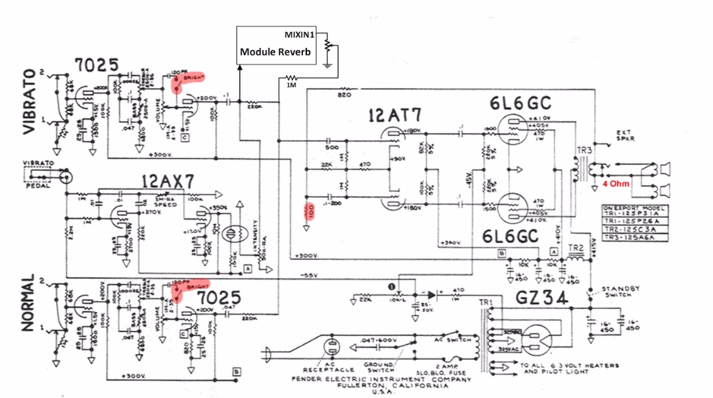 ), j'aime pas du tout ce pot de mix et sur une reverb standalone comme sur mon Bandmaster BF, j'ai fait passer le signal direct en direct, j'ai modifié le pot de mix pour qu'il ait une patte à la masse (et donc à zéro, c'est zéro) et je somme après (sur ma reverb standalone, c'est avec un circuit intégré sommateur, sur le Bandmaster c'est avec une résistance de 1MΩ (valeur mi-calculée, mi-affinée par test