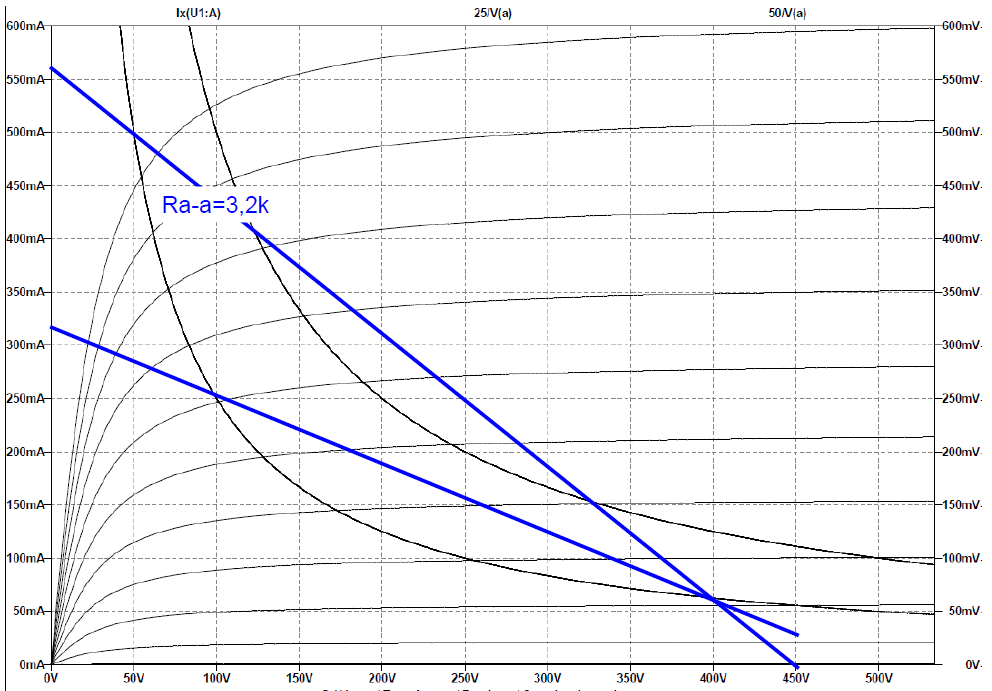 C'est du reste ce que préconise Telefunken : à VG1=-36V pour Ua=450V et UG2=375V Raa=5k et pour Ua=475V et UG2=400V Raa=4k.
