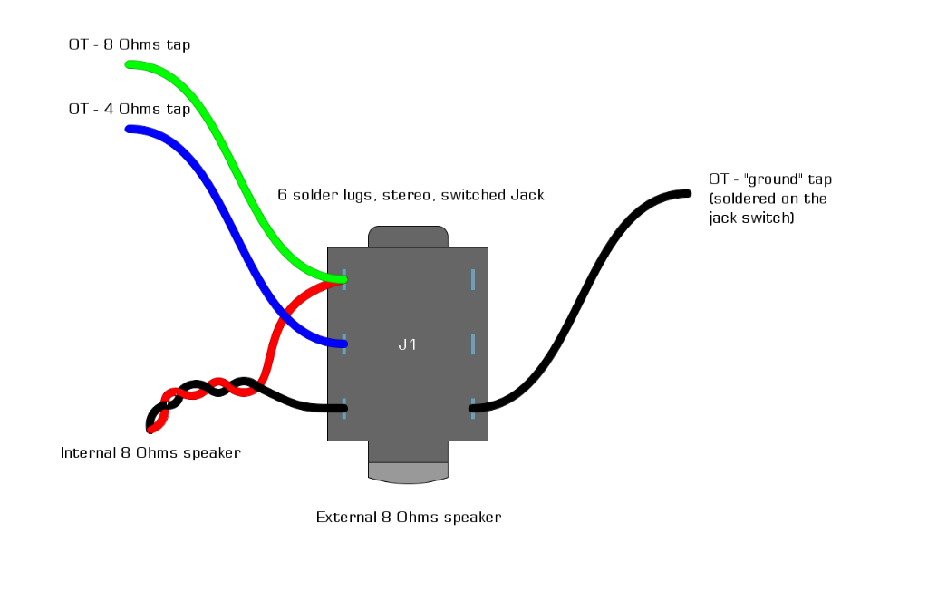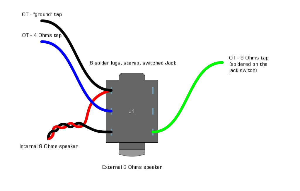 Bon, j'ai cherché, et je n'ai pas trouvé sur le net une méthode qui permette d'ajouter (pas substituer) un HP externe à un combo, avec un seul jack, et qui adapte l'impédance de l'OT.