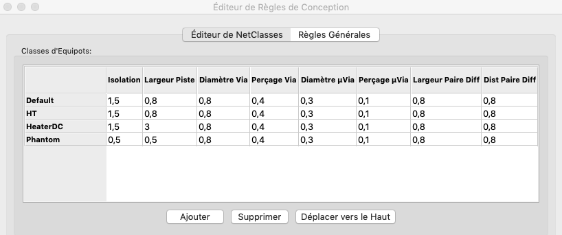 Alors, en isolation j'ai pris 1.5mm (je pense être au dessus de 300V) à cause des pins soudées, d'après la calculette Kicad. Pour les pistes, l'isolation pourrait être de 0.8mm (colonne B4) : Voici comment j'ai paramétré les règles de conception (sous Windows, le look est peut-être différent). Je ne trouve pas le paramètre "trou à trou" ...Pote Gui a écrit : 24 déc. 2020, 9:43 En A6, tu dois avoir au moins 0,4mm entre tes pins. Quand tu vas dans "Options du CI" dans le menu "fichier", puis sur "Règles de conception", quelle valeur as-ut pour la "Dist minimum trou à trou" ? Puis, dans "Classes d'équipots", quelle valeur as-tu pour le paramètre "Isolation" ?
