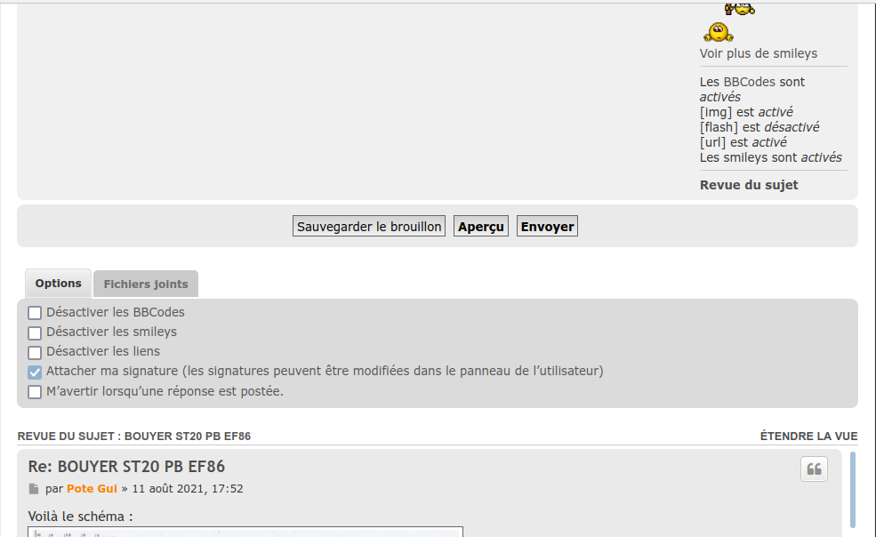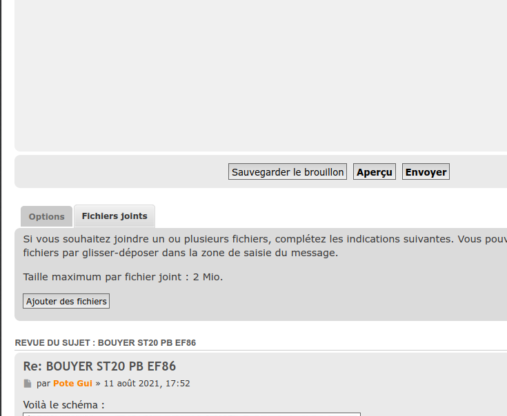Sur la page dans laquelle tu écris ton message, il y a (normalement tout en bas, au dessous des commandes "sauvegarder le brouillon", "aperçu", "envoyer") 2 onglets :