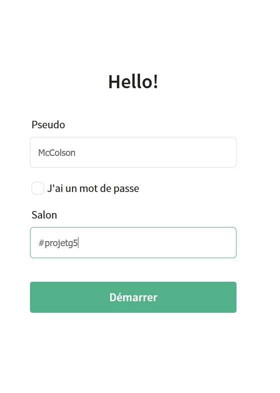Vous indiquer votre pseudo, pas de mot de passe et le salon c'est #projetg5.
