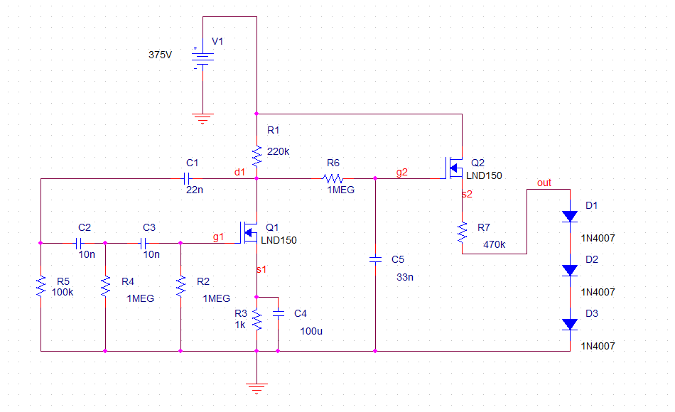 Le réseau R1C1 passe-bas est là pour éliminer les harmoniques indésirables du "sinus" produit par le LND150 . Si on peut s'en passer avec une brave 12AX7 qui produit un sinus plus ou moins patatoïdal , le LND est plus abrupt et il reste beaucoup à éplucher sur la patate