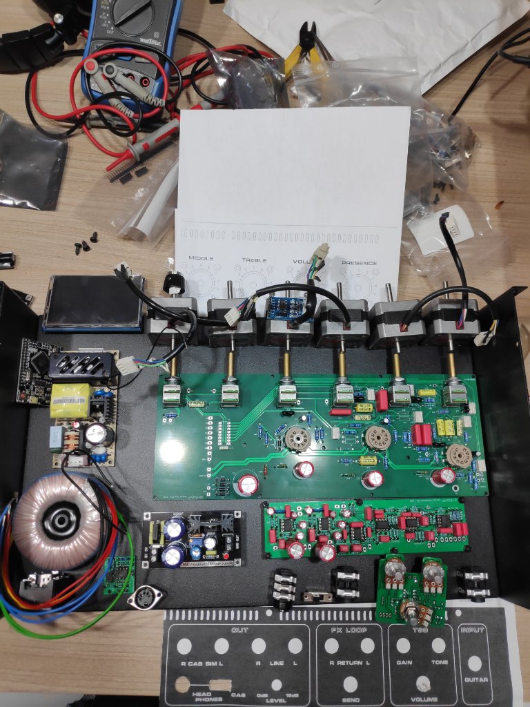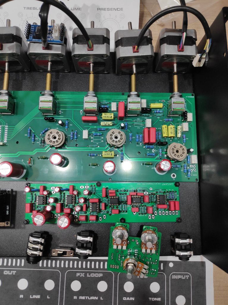 - Des moteurs pour tourner les potards et avoir des réglages infinis (x6 ! Gain,T, M, B, Présence et volume)