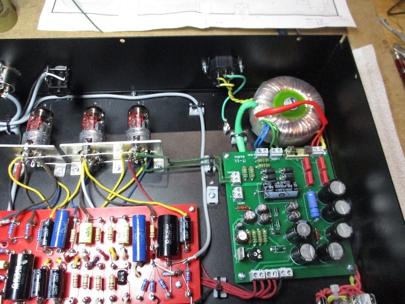 Actuellement mon proto est le 3 ème et il se présente comme ça ( j'ai tout dézingué et câblé en PTP) . Ça ne va pas être simple d'y intégrer le transfo !