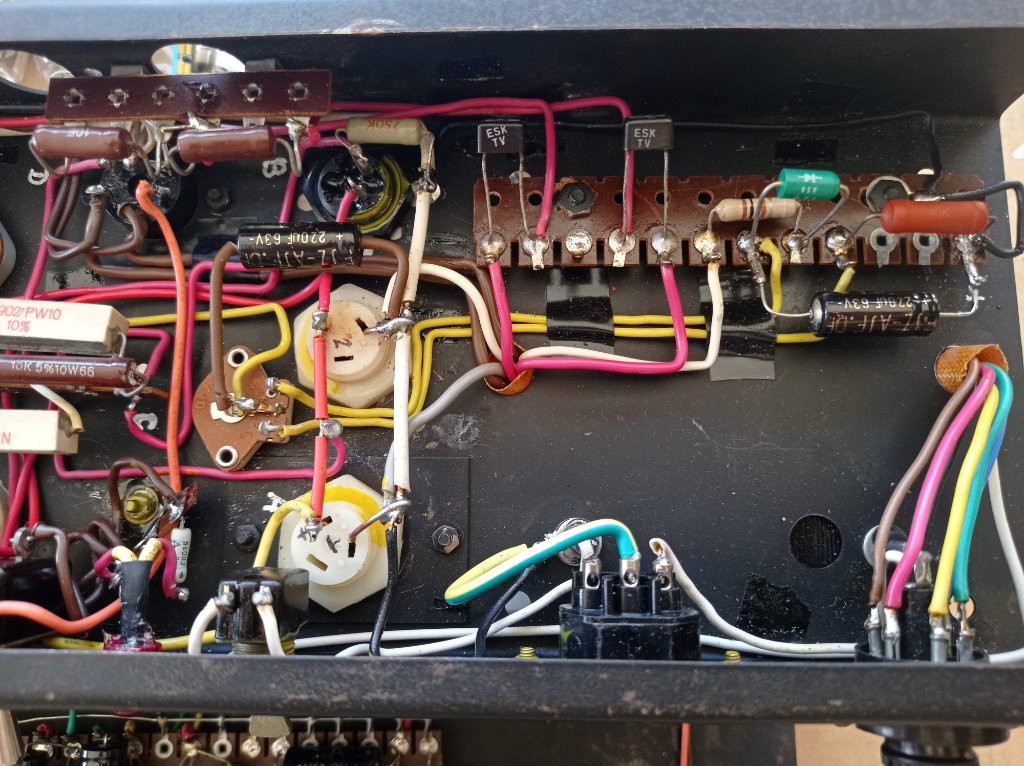 Mis à part ça, l'ampli fonctionne nickel (trémolo réverbe, préampli, PI, étage de puissance) autant au niveau du jeu à la guitare que lors de la mesure des tensions d'alimentation . Petit bémol pour la tension après la 1ère résistance de filtrage 1k qui consomme nettement plus que les 5mA envisagés sur le schéma.