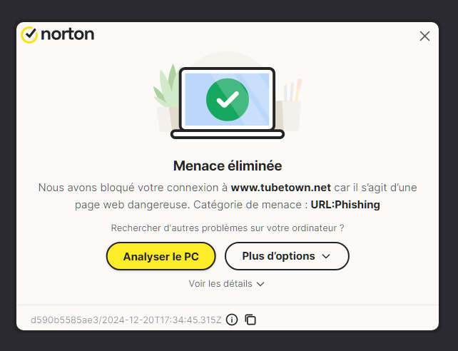 Plus moyen chez moi de me connecter à Tube-Town , Norton détecte une menace de phishing ! Et pas moyen d'en sortir
