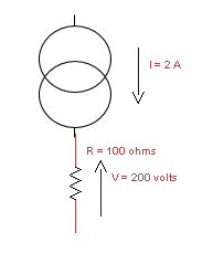 On voit ici que si I = 2 A et que R = 100 ohms la tension V aux bornes de R vaut 200 volts