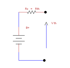 En absence de charge sur la sortie la tension mesurée Vth dite tension de Thévenin est égale à B+ (puisque le courant est alors nul dans la résistance de sortie) .